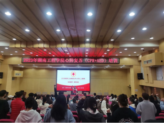 On November 25th, the 2023 Xiangtan "CPR + AED" training workshop was held by Yuetang District Red Cross and Hunan Institute of Engineering in the second lecture hall of our school. Mo Bo, president of Xiangtan Red Cross Volunteers Association, and Peng Hanhui, vice president, were invited to give lectures. The training consisted of two sessions, attended by more than 400 students from our school.