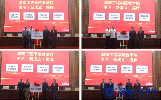 黄昕宣读学院更名文件:“计算机与通信学院”更名为“信息科学与工程学院”;“体育教学部”更名为“体育科学与工程学院”;“工程训练中心”更名为“智能科学与工程学院”;“人文通识教育中心”更名为“卓越工程师学院”。黄昕、易兵共同为更名(新成立)学院揭牌,四个学院正式领取新的“身份证”。