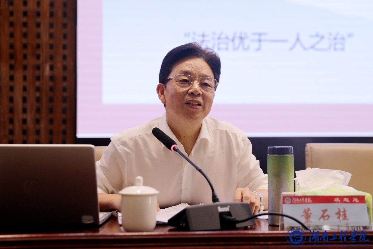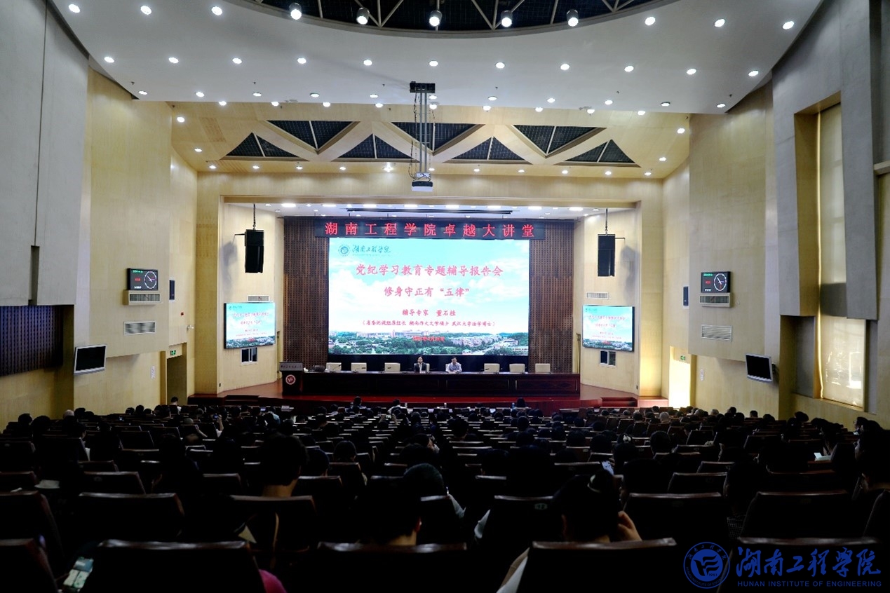 为切实推动365官网党纪学习教育走深走实,4月26日下午, 365官网在一报告厅举行“卓越大讲堂”之党纪学习教育专题辅导报告会。省委巡视组原组长董石桂博士应邀作《修身守正有五“律”》辅导报告。校党委书记黄昕主持报告会。校党委副书记、校长易兵,校领导、中层干部、科长(岗位负责人)、校纪委委员、教研室主任、党支部书记、辅导员、各单位纪委委员,纪委办、人事处、财务处、资产管理处、采购与招标管理处等全体人员参加学习。