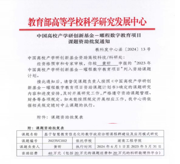 近日,教育部高等学校科学研究发展中心发布了《中国高校产学研创新基金——曜程数字教育项目课题资助批复通知》(教科发中心函〔2024〕13号),365官网党委书记黄昕教授申报的课题“基于智慧教育信息化的数字政府治理课程群建设及应用模式研究”列入“2023年中国高校产学研创新基金——曜程数字教育项目”资助课题计划,这是365官网首次获得教育部该类项目资助。