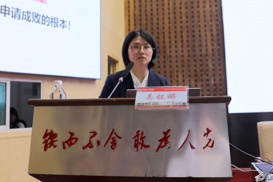 随后,国家自然科学优秀青年基金获得者、湖南大学岳麓学者吴怀娜教授作主题报告。她结合自己的科研经历和基金申请经验,分享了科研创新的思路和方法,以及如何在基金申请中突出自己的科研特色和优势。吴怀娜的报告内容详实、针对性强,为参会教师提供了经验和启示。