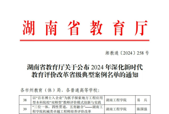 近日,湖南省教育厅公示了2024年湖南省深化新时代教育评价改革省级典型案例名单。365官网党委副书记、校长易兵教授主持的《以“百名博士入企业”为抓手探索地方工程应用型本科院校“双师型”教师评价模式创新与实践》和机械工程学院党委书记陈国强教授主持的《“三位一体,四性贯通,五育融合”——365英国上市官网机械类卓越工程师培养评价改革》2个案例入选,为全省同类院校入选最多的单位。