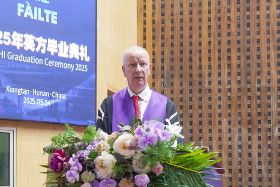 UHI珀斯校区课程总监Nicholas Inglis教授代表珀斯校区校长Margaret Cook博士致闭幕辞。他表示,在中英合作办学体系下,两校、家庭与社会如同共生系统——两校联合培育专业根基,家庭滋养精神成长,产业联通实践机遇。他勉励毕业生以“专研技术、传播文化、推动创新”为使命,永葆求知热忱、永攀学术与技术高峰,从应用型人才成长为行业引领者,在全球工程领域书写新篇章。