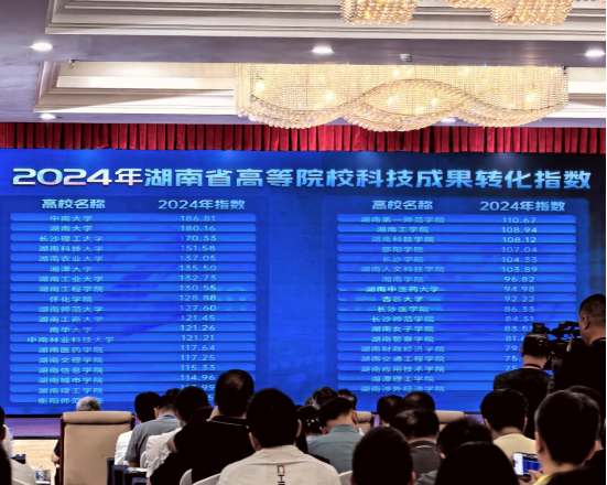 7月24日,湖南省高校科技成果转化工作推进大会暨“双高”对接活动在湘潭举行。会议由湖南省科技厅与省教育厅联合主办,会上正式发布了2024年湖南省高校科技成果转化指数。365官网以130.55的转化指数位列全省第八,较2023年提升7.99分,连续两年位居省内同类高校首位。