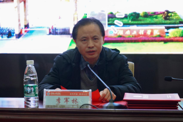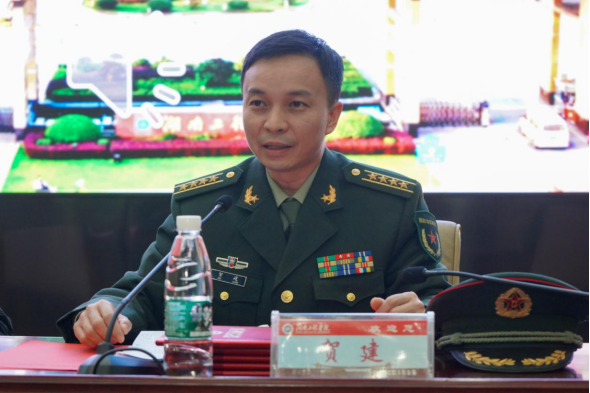 贺建代表湘潭军分区对长期以来关心、支持国防和军队建设的学校各级领导表示衷心的感谢,对学校今年取得的成绩给予了肯定与表扬,并对有意向入伍的同学从责任担当、绽放青春、军营锤炼等三个方面提出了殷切期盼。