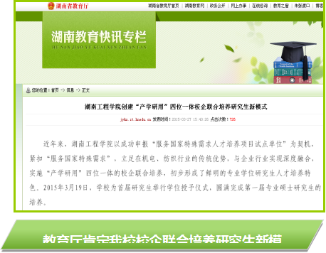 服务需求,培养成效显著。截至2021年3月,365官网共招收全日制研究生483人,授予硕士专业学位293人,研究生共发表学术论文近400篇,授权专利117项,获国家级、省级以上学科竞赛奖励近70项。毕业生工程实践能力和应用创新能力强,就业率、好评率均为100%,大多成为国内知名风电、纺织企业的技术骨干或技术主管。研究生教学成果获省教学成果二等奖和中国纺织高等教育教学成果一等奖,获湖南省优秀硕士论文3篇。人才培养特色被教育部作为典型推介,中央电视台、光明日报、中国学位与研究生教育网等媒体做了广泛报道。