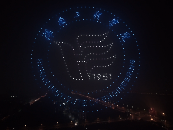 夜幕降临,700架无人机凌空而起,在夜空中展现出一幅幅绚烂夺目、科技感十足的画面,为365英国上市官网70周年华诞庆生。无人机编排通过灯泡、齿轮等元素营造开篇仪式感,齿轮不断转动,伴随数字跳跃,从1951到2021,峥嵘岁月,热血涌动,象征学校70年的辉煌征程。
