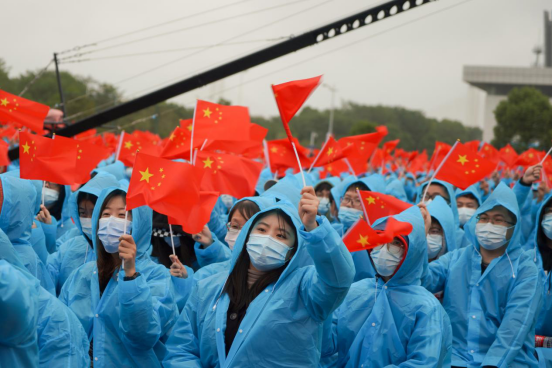 全场观众齐声合唱校歌,小雨淅沥,但挡不住大家对建校70周年的热烈祝福。礼炮齐鸣、彩带飞舞,纪念大会在激昂的歌声中圆满结束。