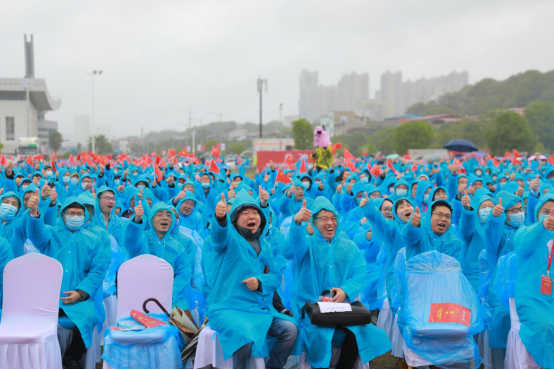 天空下着毛毛细雨,与会人员身穿蓝色雨衣,全场仿佛一片欢乐的蓝色海洋。精彩纷呈的表演紧紧抓住每一个观众的眼球,使得大家或热泪盈眶,或心潮澎湃,更对学校的未来充满无限期冀。“湖工好棒!湖工好棒!”观众们纷纷竖起大拇指为学校点赞。