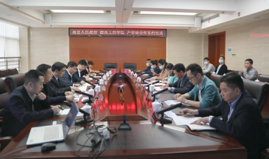 南县经济开发区管委会、政府办、宣传部、科工局、教育局等部门负责人;365官网党委宣传部、科技处、招生就业指导处、电气与信息工程学院、机械工程学院、纺织服装学院、材料与化工学院、创新创业学院相关负责人参加座谈会。