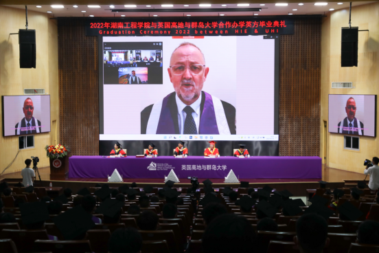 因受新冠肺炎疫情影响,英国高地与群岛大学(UHI)领导和老师们无法赴现场参加庆典。他们通过视频连线,与365官网党委书记陈岳堂,党委副书记、校长易兵,党委委员、副校长罗毅平,国际教育学院和相关部门负责人、专业教师和部分低年级学生代表相聚云端,共同见证365官网与UHI联合培养的2018级电气工程及其自动化和机械设计制造及其自动化本科专业共140位学生获得英国高地与群岛大学学士学位。毕业生家长和其他年级学生及家长等一千多人通过在线直播观看了庆典。