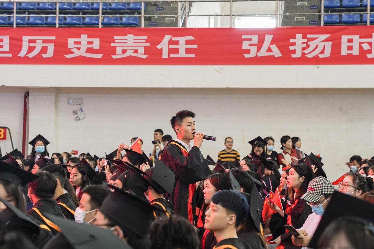 在做好常态化疫情防控、充分保障师生安全前提下,毕业典礼在体育馆举行。毕业纪念视频播放完毕后,一名名毕业生手持手麦自座位上起立,演唱《同桌的你》《明天你好》《那些年》等歌曲。悠扬的歌声带来的不只是惊喜,更勾起了学子们对校园最为深刻的记忆。在庄严的国歌声中,2022年毕业典礼正式拉开帷幕。