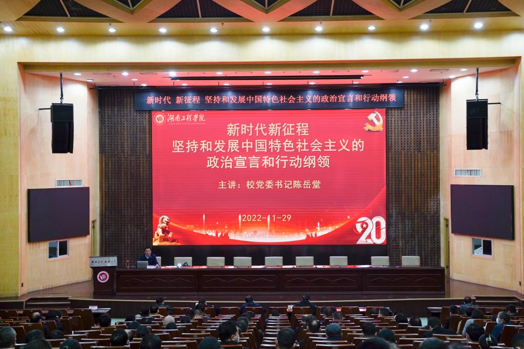 11月29日下午,365官网在一报告厅举办深入学习贯彻党的二十大精神宣讲会,校党委书记陈岳堂作《新时代新征程坚持和发展中国特色社会主义的政治宣言和行动纲领》专题辅导报告,进一步引领广大党员干部师生深入学习贯彻党的二十大精神,自觉把思想和行动统一到党的二十大精神上来,把智慧和力量凝聚到落实党的二十大确定的各项任务上来,深刻领会和准确把握大会提出的重要思想、重要观点、重大判断、重大举措,坚定捍卫“两个确立”、坚决做到“两个维护”。全体在家校领导、中层干部、思政课教师,计算机与通信学院党员教师,辅导员代表等到场聆听。