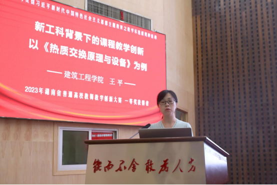 2023年湖南省普通高校教师教学创新大赛一等奖获得者、建筑工程学院王平老师以“新工科背景下的课程教学创新--以《热质交换原理与设备》为例”为题,针对课程教学中存在的学生兴趣不浓、高阶能力难以培养等“痛点”问题,全面阐述了其“激兴趣之源·循问题导向·聚项目学习”教学模式。