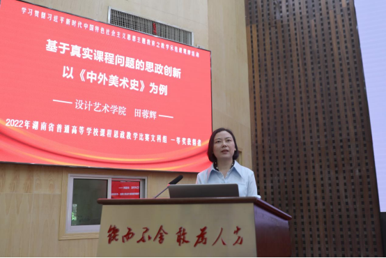 2022年湖南省普通高等学校课程思政教学比赛文科组一等奖获得者、设计艺术学院田蓉辉老师以“基于真实课程问题的思政创新——以《中外美术史》为例”为题,从新文科建设背景出发,围绕“如何立足设计学学生的真实难题进行课程思政创新”“如何从重视课程建设、创新思政体系、改进教学方法三个维度进行课程思政教学设计”等方面分享了个人心得。