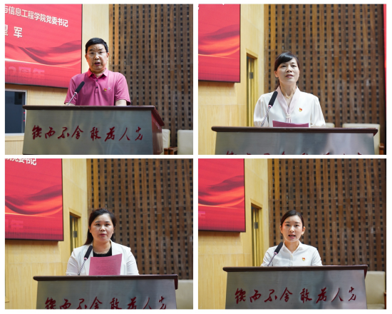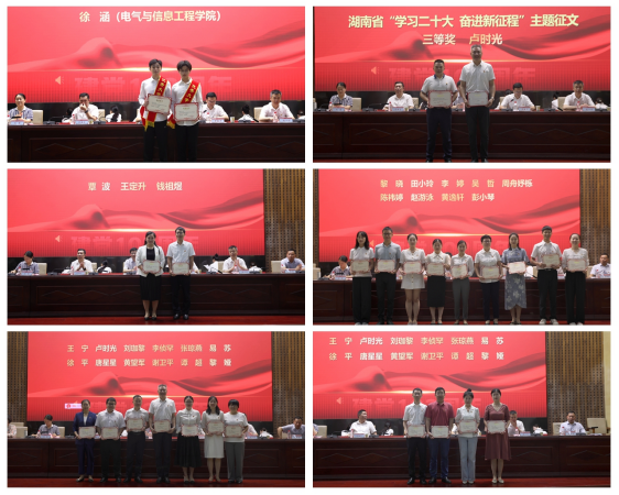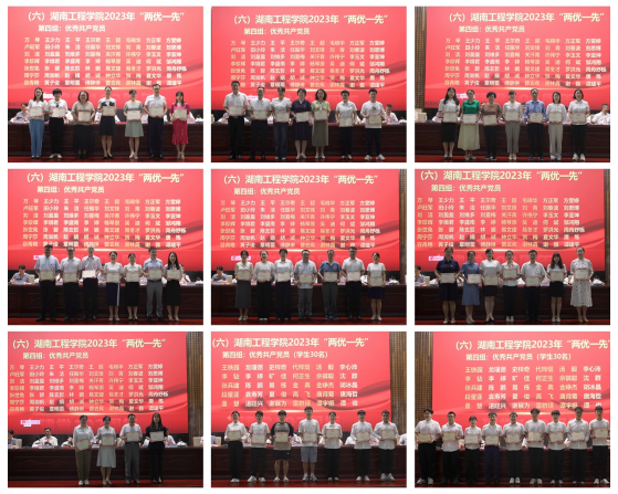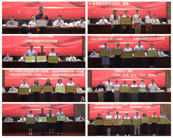 随后,与会校领导向学校“光荣在党50年”的4位老党员代表盛豹武、凌扬云、熊仁求、罗忠烈颁发纪念章,并为受表彰的先进集体、优秀个人代表颁奖,为省级以上先进集体和个人佩挂绶带。大会表彰了管理学院教工第二党支部等23个先进基层党组织,刘喜梅等113名优秀个人。先进基层党组织代表电气与信息工程学院党委书记黄望军、全国党建样板支部管理学院教工第二党支部书记、“双带头人”标兵刘喜梅、优秀党务工作者代表机械工程学院党委书记覃波、优秀共产党员代表材料与化工学院黎晓作典型发言。