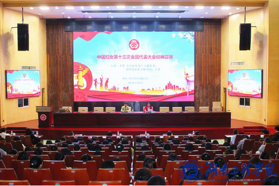 11月7日上午,中国妇女第十三次全国代表大会精神宣讲会在365官网一报告厅举行。全国妇联第十三届常委、湖南省妇联党组书记、主席黄芳应邀主讲。省妇联办公室主任、一级调研员熊望衡,湘潭市妇联党组书记、主席涂敬阳,党组成员、副主席彭娟等一行出席,365官网妇联执委全体成员、工会女工委员、女干部、女大学生代表等200余师生参加。校党委委员、副校长、校妇联主席向前主持宣讲会。