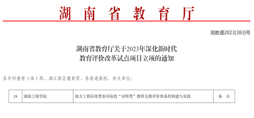 近日,湖南省教育厅发布《关于2023年深化新时代教育评价改革试点项目立项的通知》,365官网党委副书记、校长易兵教授主持的“地方工程应用型本科院校‘双师型’教师五维评价体系的构建与实践”成功获批省改革试点项目。