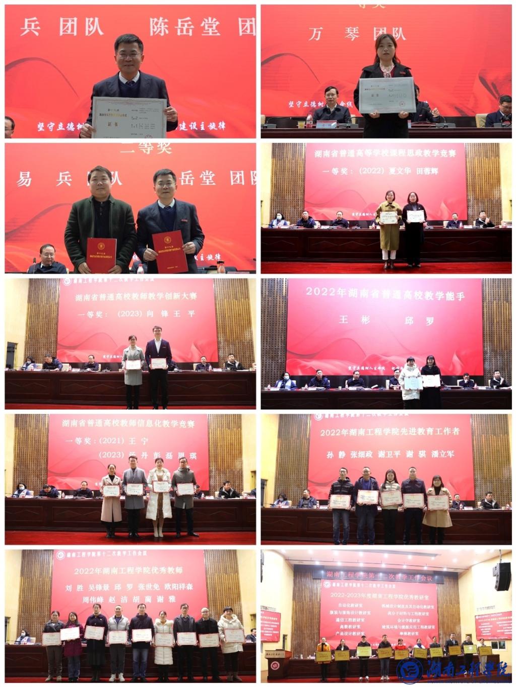 分组讨论后,大会举行表彰仪式。易兵主持仪式。副校长陈赤平宣读2021-2023年度教学建设与改革表彰名单。校领导为获奖的集体和个人分别颁奖。
