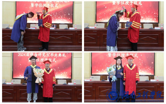 典礼表彰了湖南省优秀硕士论文指导教师、校优秀硕士学位论文获得者及其指导教师、校长奖获得者、2024届校优秀硕士毕业生。易兵宣读了硕士专业学位授予决定,为2024届硕士专业学位获得者施拨穗礼并授予学位证书。