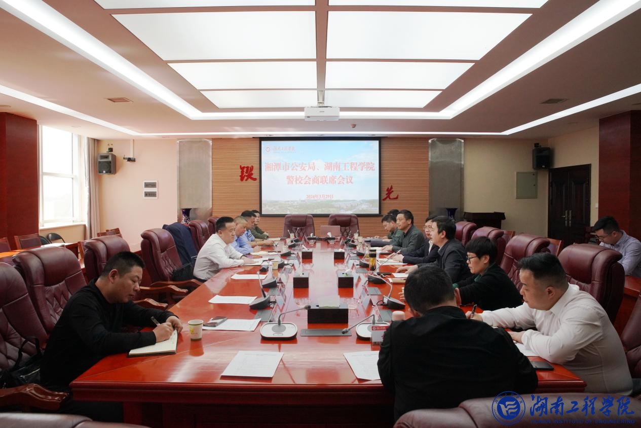 为全面推进警校会商工作,着力营造平安、有序、和谐的校园环境,3月29日下午,湘潭市公安局党委委员、副局长贺剑鹏带队深入365官网调研,并在二会议室召开警校会商联席会议,会商促进365官网安全稳定相关工作。校党委书记黄昕,党委委员、副校长张小刚出席。