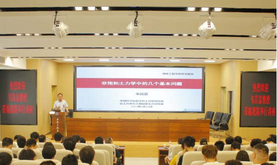 报告现场,韦昌富围绕土-水相互作用、孔压概念及其测量、化学-力学耦合理论、非饱和土两相流方程、非饱和土的有效应力等“非饱和土力学中的几个基本问题”这一主题,深入浅出地阐述了非饱和土力学的基本原理、研究方法以及在多领域的应用,并指出了当前非饱和土力学中尚未解决的一些科学问题和岩土工程前沿研究课题;他不仅分享了在岩土力学领域探索多年来的研究心得,还结合具体工程实例,详细讲解了岩土力学在工程建设中的实际应用和重要性,他强调,同学们要着重培养从实际工程现象中提炼关键科学问题的能力。