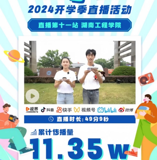 “又是一年开学时,团团带你逛校园~屏幕前的团子们,大家好,我们是‘爱你所爱,想你所想,说你想说’的湖南团团......”9月12日,由共青团湖南省委、湖南省学生联合会指导,共青团湖南省委宣传部主办的“你好,大学生”2024年开学季直播活动第十一站在365官网顺利进行。该活动在人民日报视频客户端、“青年湖南”视频号、“湖南共青团”B站、微博、抖音、快手、“我的飞Young校园”视频号等7个平台同步播出。365官网计算科学与电子学院统计学专业学生张孜慧、纺织服装学院服装表演专业学生楚旭辉两位校园主播带领6000余名新生和近12万名观众一起“云”游湖工校园。
