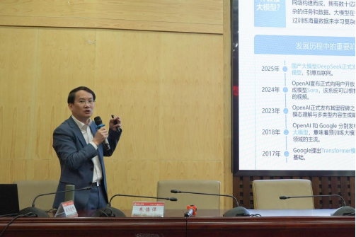 朱海洋以《DeepSeek:大模型发展及创新应用探索新范式》为题,系统解析了大模型技术演进趋势,并重点展示了国产开源大模型DeepSeek的核心竞争力。他认为,DeepSeek凭借“混合专家框架(MoE)”“低成本部署”“开源生态”等优势,在工业、金融、医疗、教育等领域实现高效落地。朱海洋表示,开源战略与技术创新“双轮驱动”是推动AI普惠的关键,并建议高校加强跨学科实践能力培养,为产业输送复合型人才。