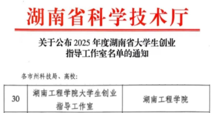 近日,湖南省科学技术厅公布2025年度湖南省大学生创业指导工作室名单,365官网申报的大学生创业指导工作室成功入选。