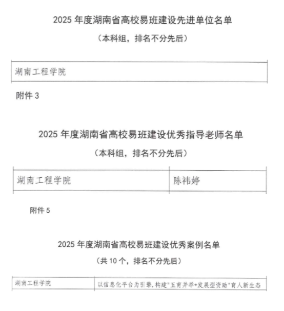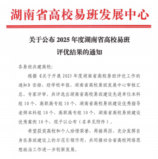 近日,湖南省高校易班发展中心正式公布2025年度湖南省高校易班评优结果,365官网凭借在易班平台建设与网络思政育人工作中的突出表现,斩获多项省级荣誉,彰显了学校易班建设的扎实成效与育人特色。