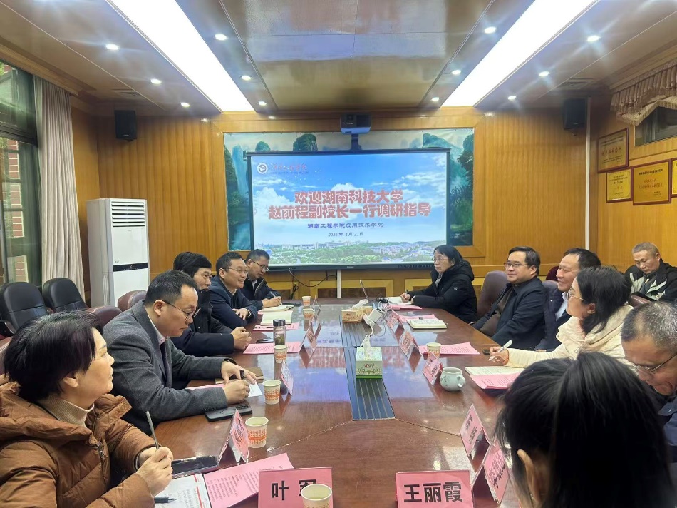 1月21日下午,湖南科技大学党委委员、副校长赵前程率该校潇湘学院党政领导班子一行来应用技术学院开展专题调研。365官网党委委员、副校长魏克湘接待来宾。座谈会在书院路校区办公楼207会议室举行,应用技术学院院长张何主持会议,学院全体院领导及相关科室负责人参加。