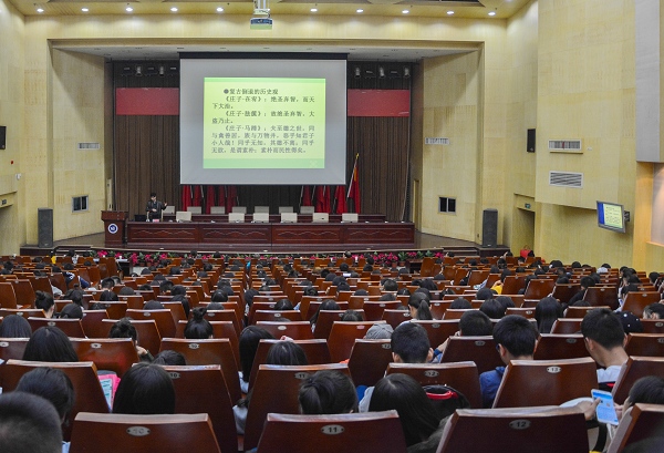 10月31日晚,木鱼湖论坛第八讲在一报告厅举行,湖南科技大学吴广平教授做客木鱼湖论坛,作题为“庄子的智慧”学术讲座。党委宣传部部长曾曙林主持论坛,400余位师生和社会各界朋友到场聆听,全场座无虚席。
