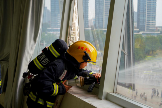 为解救被困学生,在图书馆外的消防队员利用登高平台消防车开展救援。救援人员佩戴好安全帽、做好安全措施后,使用升降云梯到达被困学生位置,稳定被困学生情绪,在保证被困学生人身安全的情况下顺利将她转移到云梯上,成功救出被困学生。