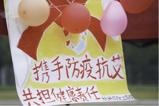 师生们在签名墙上签上自己的名字,表达参与防治艾滋病的决心。一首《让世界充满爱》的大合唱,开启防艾知识问答、“艾的抱抱”等环节。外国语学院将病毒、疫苗、人体免疫系统三者关系改成的趣味游戏,用飞镖“射击”带有“病毒”的气球,让同学们了解艾滋病毒;应用技术学院则采取“有奖套圈”游戏激励同学们参与防艾活动;电气与信息工程学院海报上的小贴纸书写着对艾滋病患者的关怀寄语……各学院通过游戏参与,宣传防艾知识。