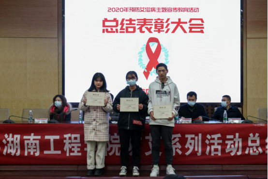 大会为防艾主题宣传教育系列活动中表现突出的团体及优秀个人颁发荣誉证书,其中于丹洋、任婉华、黄熙三人分别获得“防艾演讲比赛”一、二、三等奖,电气与信息工程学院、管理学院、纺织服装学院等10支团队获“优秀‘社区’集体奖”和“优秀宣传板画”奖,易建军、付嘉慧等18人获“优秀志愿者”称号,张子璇、张子超2人获“优秀个人”奖,测控技术与仪器2001班等6个班级获“优秀主题班会”奖,计算科学与电子学院、建筑工程学院、国际教育学院等3个学院获优秀组织奖。