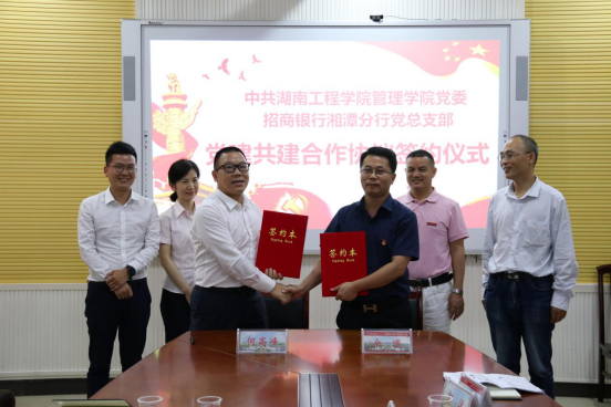 6月11日下午,管理学院与招商银行湘潭分行党建共建签约仪式在F-104会议室举行。组织部部长李永坚,管理学院党委书记余博,管理学院党委副书记、院长徐运保及招商银行湘潭分行党总支书记、行长何高峰,招商银行湘潭分行副行长刘丽卓等校银双方10余人参加,仪式由徐运保主持。