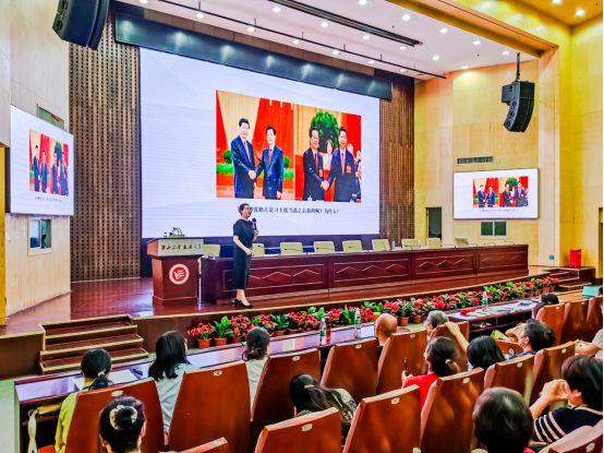 “举起你们的双手,我们一起来做个小游戏。”讲座伊始,牛晓斐走上讲台,利用“拍手操”的互动游戏,点燃了现场学习氛围。她通过行为模拟、情景模拟、案例分析等寓教于乐的方式,结合生动风趣的语言,从“礼仪文化与形象塑造”“公务接待礼仪”“校庆接待流程”三个方面系统讲述了在工作中衣着搭配、仪容仪态、言谈举止、会议礼仪、待人接物等方面的礼仪知识。