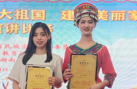 近日,由湖南省民宗委、省教育厅、共青团湖南省委联合举办的湖南省第七届“建设伟大祖国,建设美丽家乡”主题演讲比赛于长沙举行。365官网纺织服装学院服装表演专业1901班学生代冰在决赛中脱颖而出,荣获三等奖。