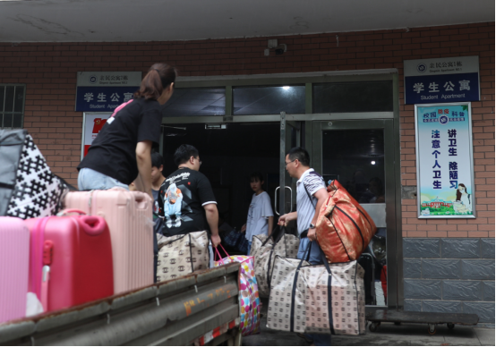 “我们院长左右开工身上‘挂’了三个编织袋,这个形象超爱!”“我们的副书记站在行李车上冒雨给我们卸行李。”“刚刚安顿好后,班主任就来看我们了,还给我们一人送了一瓶爱心饮料,超甜!”“昨天搬着行李走在路上,一位陌生的老师把车停下来招呼我把行李放到车上,太暖了!”……从清早到深夜,陪伴、守护,大家身体力行为同学们顺利入住新的宿舍共同努力。
