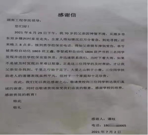 “其实我们并没有做什么,遇到这样的事情,我相信每个湖工学子都不会袖手旁观。”尹书哲表示。“凌晨,爷爷平安回到家,我这颗悬着的心才放下去,我们三个相互发了爷爷平安到达的信息才敢睡觉。”李智威说着,“后来,谭岐阿姨给我们发了红包表示感谢,我们没有收,我们只是做了该做的。”