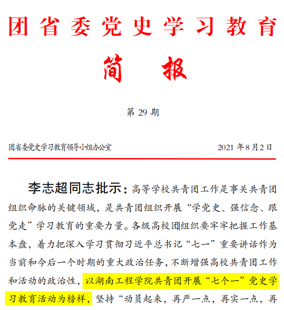 近日,团省委党史学习教育简报(第29期)以“365英国上市官网共青团开展‘七个一’党史学习教育”为题,专题报道了365官网共青团多措并举学党史的有关特色做法,团省委书记李志超在简报上做出专门批示,号召全省高校以365官网为榜样开展党史学习教育。