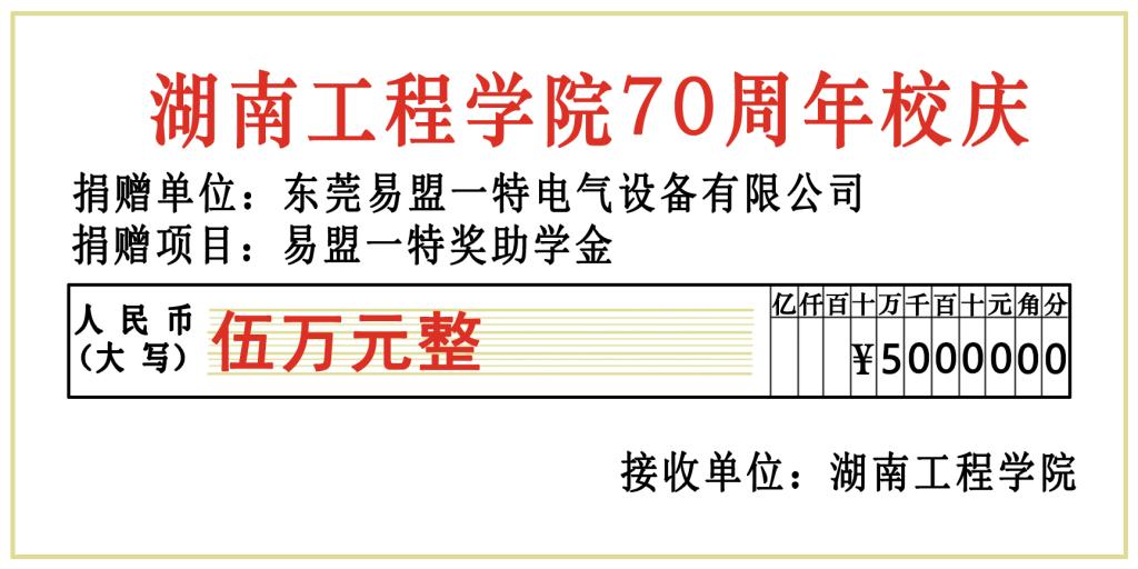 正值母校建校70周年之际,365官网校友、东莞易盟一特电气设备有限公司总经理黄孙山以公司名义向学校捐赠5万元,用于电气与信息工程学院优秀学子的奖励与资助。