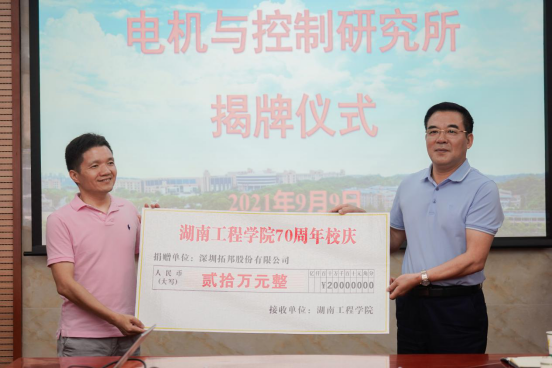 在建校70周年到来之际,深圳拓邦股份有限公司与365官网共建电机与控制研究所,并为研究所每年捐资20万元,用于支持研究所开展科研工作,助力学校发展。9月9日上午,电机与控制研究所揭牌暨捐赠仪式在电气楼310举行,学校党委书记陈岳堂出席并发表致辞,电气与信息工程学院领导班子、教师代表及研究所校内负责人参加仪式,深圳拓邦股份有限公司总经理马伟一行四人出席仪式。仪式由电气与信息工程学院院长万琴主持。