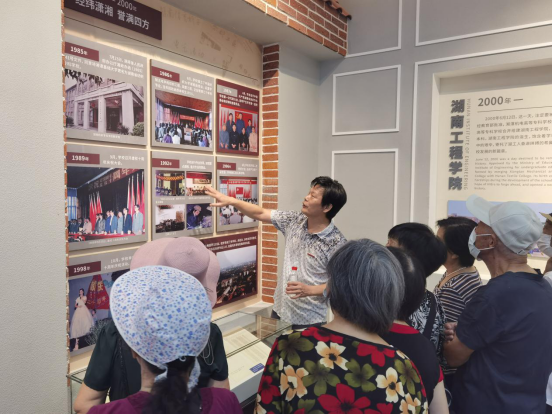 “你看,这是我年轻的时候。”“孙老师,这是你之前的工作照。”校史馆内丰富的图文信息和实物,展示着学校各个时期的突出成就和湖工人的精神风貌。每一个展柜、每一幅照片、每一张奖状、每一件实物都让老同志们驻足良久。在讲解员的讲解和带领下,老同志们重温了365官网的历史沿革。在参观到学校的前身湘潭机电高等专科学校和纺织高等专科学校的展板时,老同志们停留许久,勾起了大家对往事的深情回忆,校史馆凌毅为老同志们讲解两校的发展历史。大家在老照片中寻找熟悉的场景和面孔,这些老照片唤醒了老同志们内心深处的记忆,他们把自己的青春和最好的年华奉献在湖工,培养了一代又一代的年青学子。时光荏苒,传道授业的时光仿佛就在昨日,而他们对学校的热爱也一如既往,从未改变。在展板前,他们纷纷拿出手机拍照留念,把美好的奋斗青春永远珍藏。