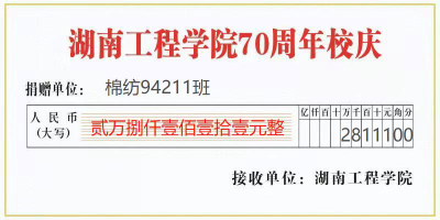 “虽然阔别多年,但棉纺94211班同学们一直心系母校。在得知学校建校70周年的消息后,他们想尽自己一点绵薄之力,贡献班级力量。”班主任刘常威表示。棉纺94211班的同学们积极响应,筹集捐款。班级同学们也祝贺母校峥嵘岁月如隔日,薪火承续正当时;愿湖工人初心不改图进取,继往开来创辉煌。