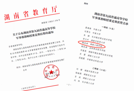 12月30日,省教育厅正式发文公布湖南省第九届普通高等学校军事教师授课竞赛成绩,365官网参赛教师陶连洲和来自中南大学、湖南中医药大学、中南林业大学等高校的其他8位教师获得一等奖,来自湖南农业大学、湖南工业大学、长沙理工大学等高校的14位教师获得二等奖。