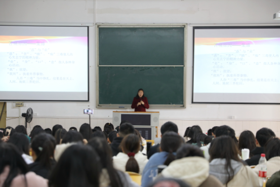 上课前,熊国玲提前十分钟来到教室,在讲台上默默注视着她的“关门弟子”。上午10点10分,《中外文化概论》开始上课。熊国玲的课堂和平时没有什么不一样,但教室里学生却有些“躁动”——一场专门为熊国玲精心准备的退休仪式正在悄然酝酿。叮铃铃下课铃响了,电子幕布上同学们提前准备的祝福语显现出来——“广告学21级感谢熊妈教导”。这时,校党委委员、副校长向前和设计艺术学院班子成员手捧鲜花来到教室,把鲜花献给了熊国玲,向她圆满的职业生涯表示祝贺。同学们全体起立,为熊国玲献唱《感恩的心》,并配上手语动作。百余位师生,瞒着熊国玲,策划了这样一场盛大的告别仪式,来纪念她教学生涯的最后一课。惊喜、感动、欣慰,熊国玲眼含热泪。