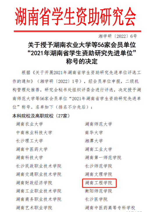 “2021年湖南省学生资助研究先进单位”荣誉称号的获得,是对学校多年来学生资助工作的充分肯定和极大鼓励,是全校师生员工共同努力的结果。学校将坚持以习近平新时代中国特色社会主义思想为指导,持续推动365官网资助育人实效,以优异成绩迎接党的二十大胜利召开。