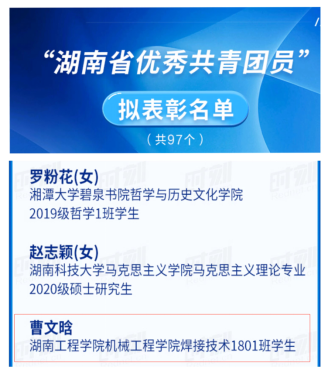 近日,共青团湖南省委、共青团湘潭市委、共青团湘潭市岳塘区委相继做出表彰决定,对一批基层团组织和个人授予五四红旗团委、五四红旗团支部、优秀共青团员、优秀共青团干部荣誉称号。365官网共获省级奖项2项、市级奖项5项、区级奖项28项,其中365官网团委书记刘琤获评湖南省优秀共青团干部荣誉称号,机械工程学院焊接技术1801班学生曹文晗获评湖南省优秀共青团员荣誉称号。