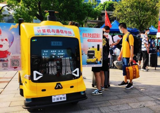 新生报到,天气炎热,计算机与通信学院为方便新生报到,为他们提供贴心服务,投入5台“小黄”。“小黄”集自主驾驶、现场遥控驾驶、远程平行驾驶于一体,可稳定通过校内上坡、下坡、减速等地段,将校园生活变得更加智能化,也更加安全便捷。“小黄”操作方便,打开柜门,将行李放置柜内,设定好路线,就能自行将行李运送至宿舍。“高科技真是太方便了!运行平稳、载重大,几个人的行李一次就送到宿舍楼下。” “这个机器人感觉太厉害了,希望在学校的四年,能够学习到更多专业知识。”新生纷纷表示。